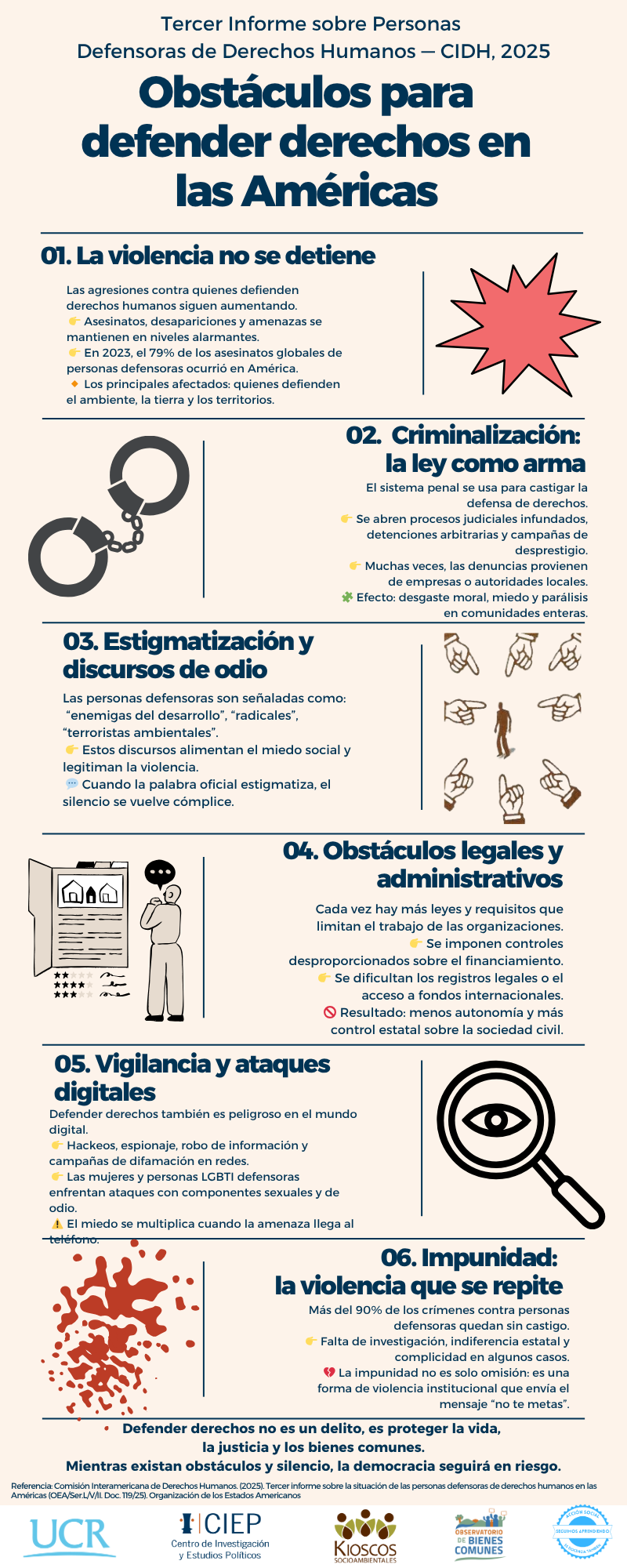 La impunidad es una forma de violencia prolongada. Por ello, los Estados están obligados a investigar con debida diligencia los ataques contra personas defensoras, sancionar a los responsables y reparar integralmente a las víctimas. La CIDH también recuerda la importancia de cumplir con las medidas cautelares otorgadas por el Sistema Interamericano.